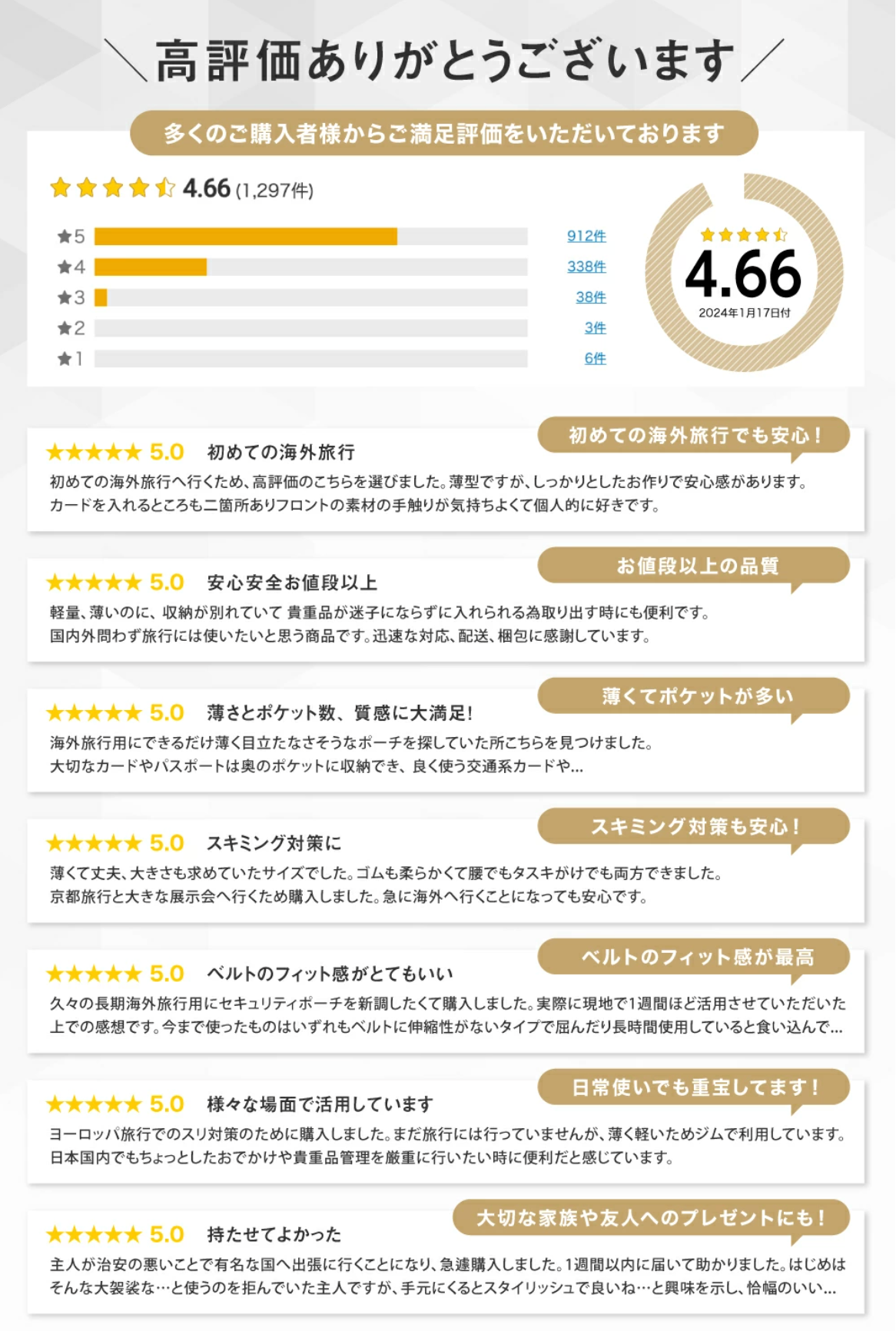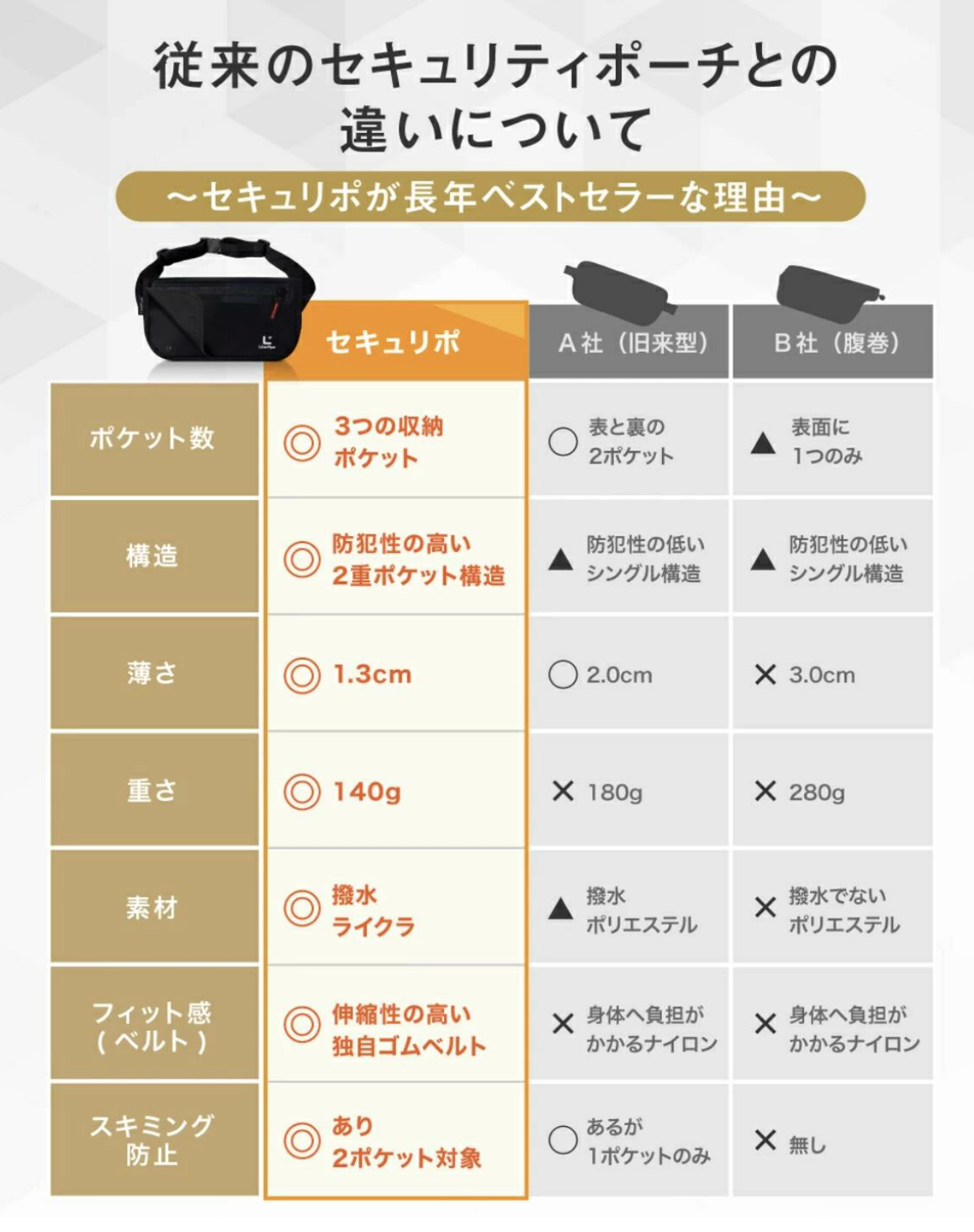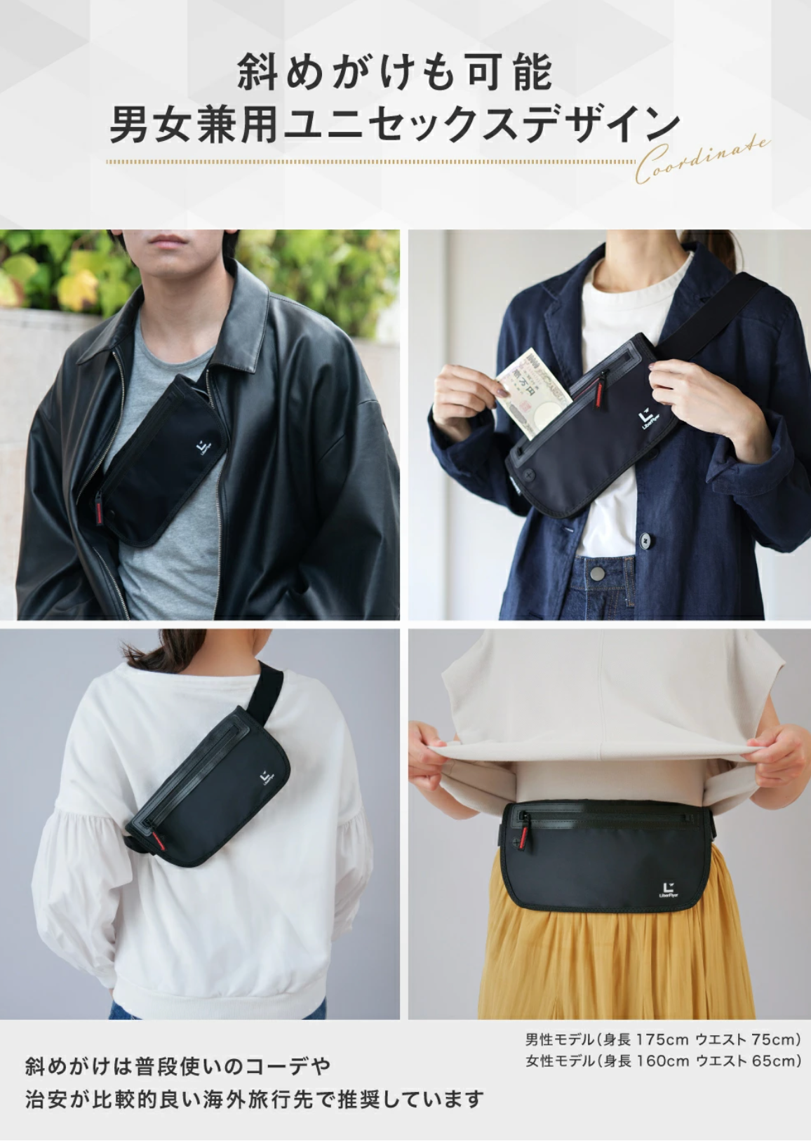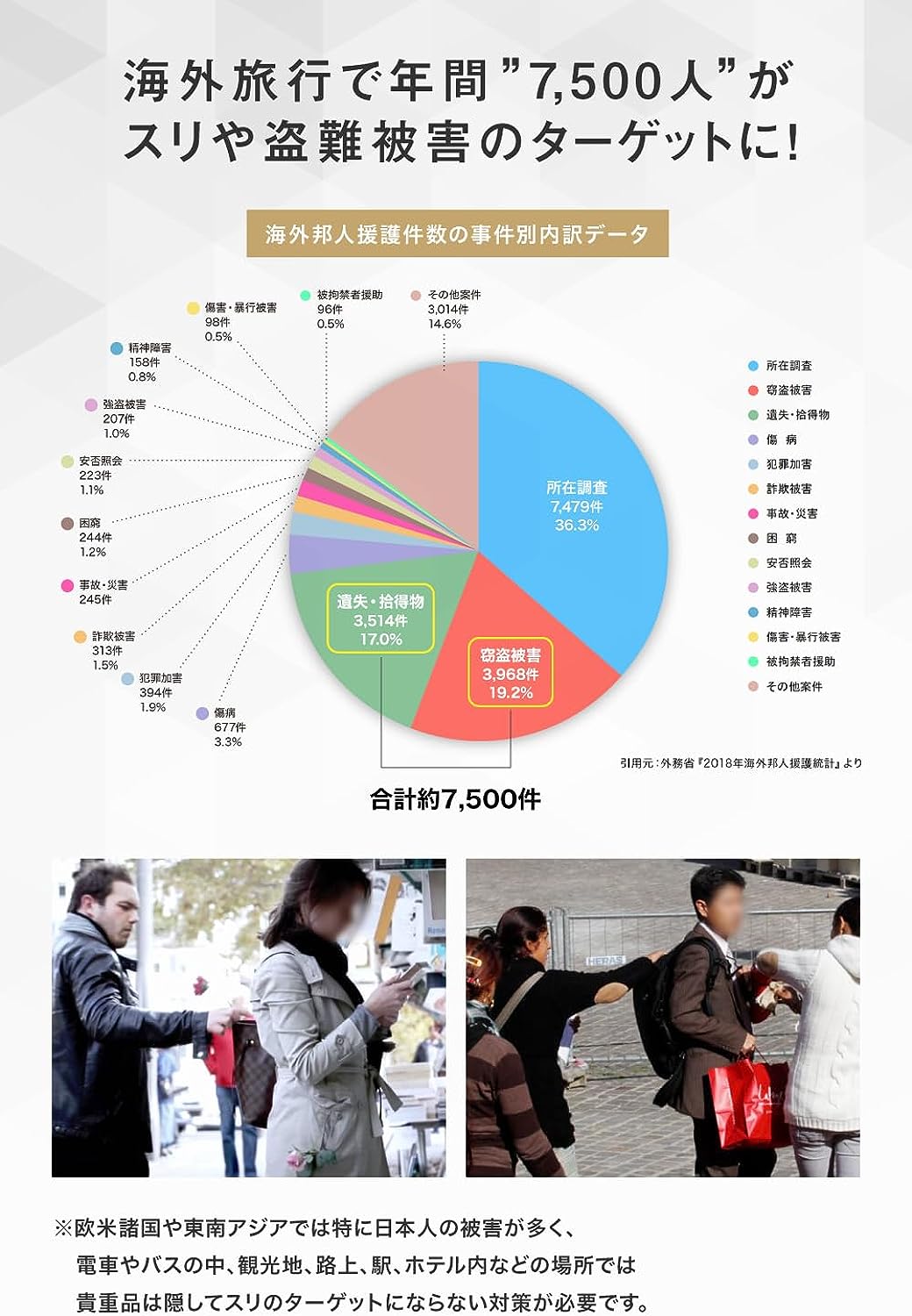 【海外旅行でのスリ被害をゼロに】:外務省のデータでも年間平均7,500人以上の日本人がスリや盗難などの犯罪被害に遭遇している現状があります。1人でも多くこのような被害に遭って旅行が台無しにならないように、海外旅行の貴重品管理に関する悩みを300人以上にアンケート調査し、隠しやすさや収納性、防犯機能性、デザイン性など誰もが安全でスマートに旅を楽しめるセキュリティポーチを開発しました。