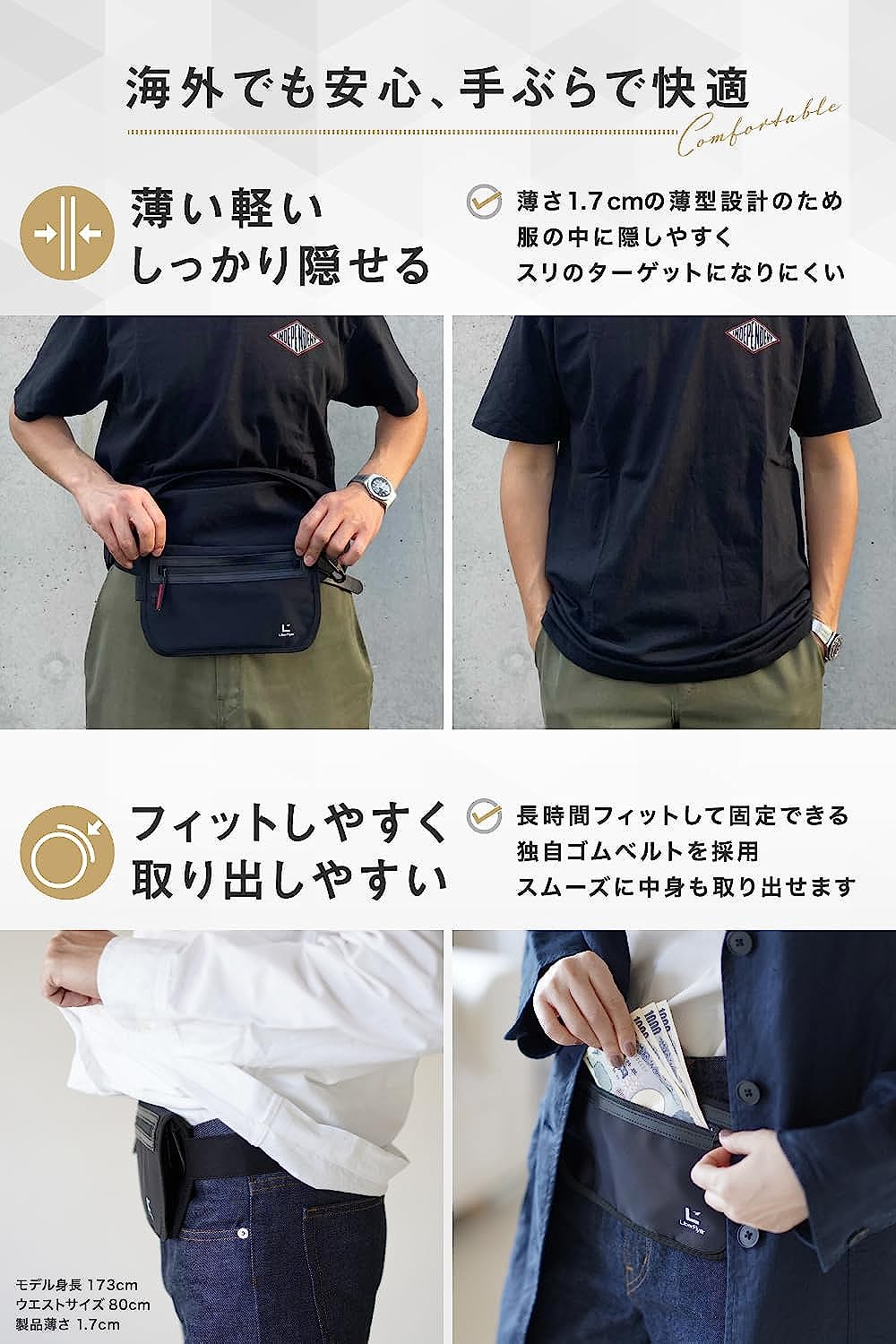 【薄くて軽くてしっかり隠せる】:1.3cmの薄型設計のため服の中にも隠しやすく、外からも着用が分からない防犯に特化したデザイン。