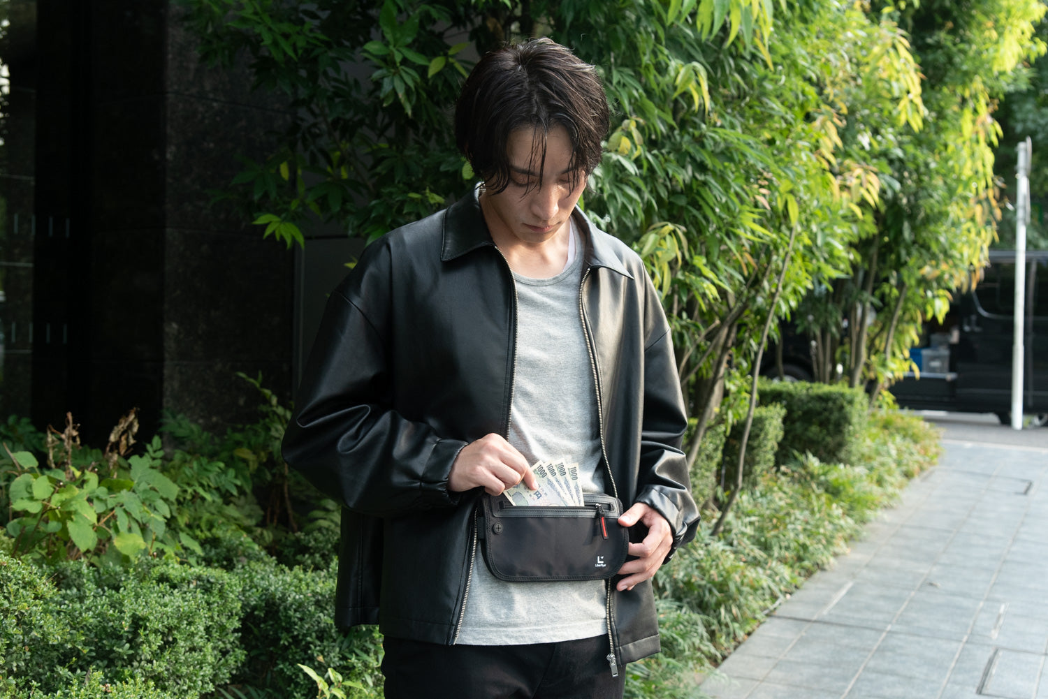 【貴重品を安心して守る機能】:(1)スキミング防止機能(※フロントとメインポケットに適用)(2)撥水ライクラ素材(3)高品質YKKジッパー を採用し、使うたびにその安全で快適な機能性を実感できるスペックに。