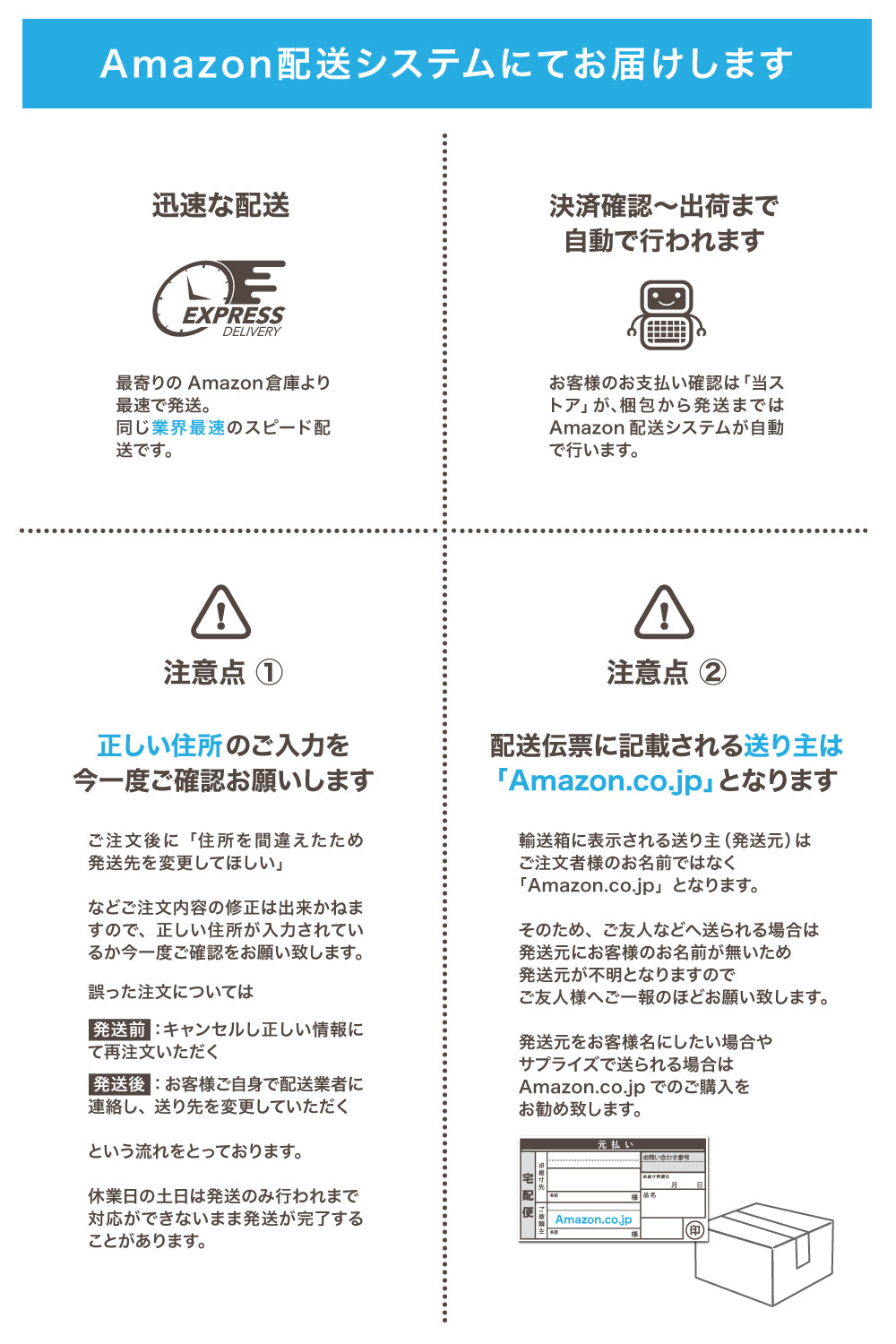 【Amazon配送にてお届け】:提携先のアマゾンジャパン倉庫配送システムより発送いたします。ご注文後、2-4日以内に発送し、3日-7日以内にご到着可能な便にてお届けいたします。